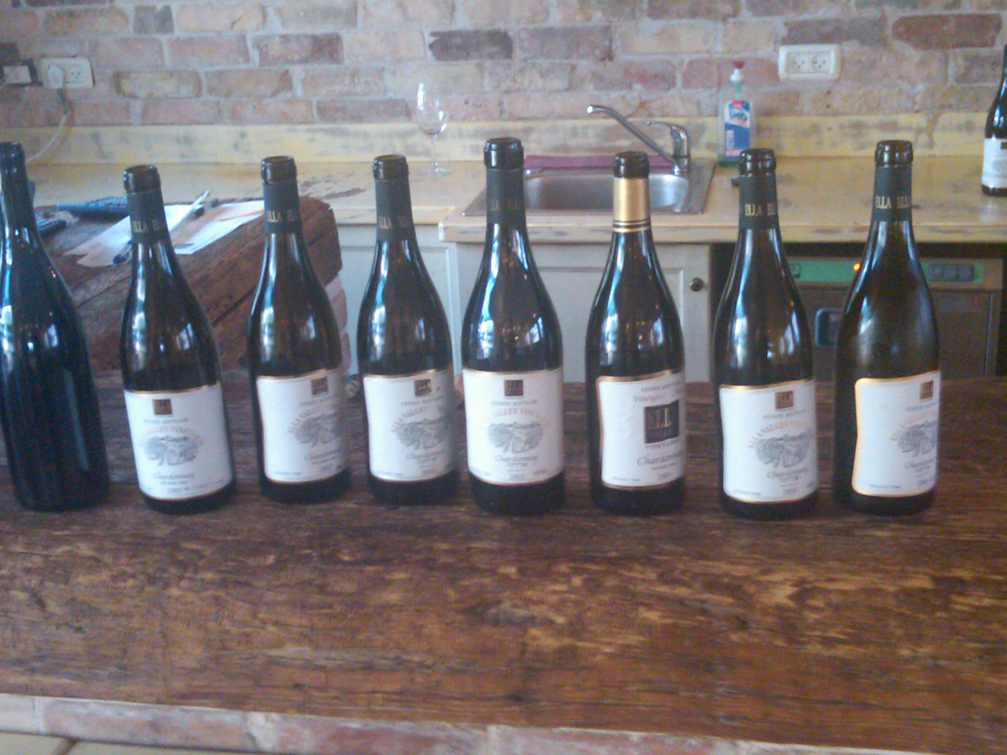 The wine tasting room is themed after an oak cabin in manners, with warm colors and brick adorning the walls. The styling may be a bit old-fashioned, but the room is filled with every imaginable new world amenity, down to the ever important espresso machine! Once we had our needed shot to start the day, we were honored to sit down with the head wine maker, Doron, for a horizontal tasting of all of Ella Valley’s white Chardonnay wines. It was really quite a sight to see all the wines lined up for the tasting on the wine bar.