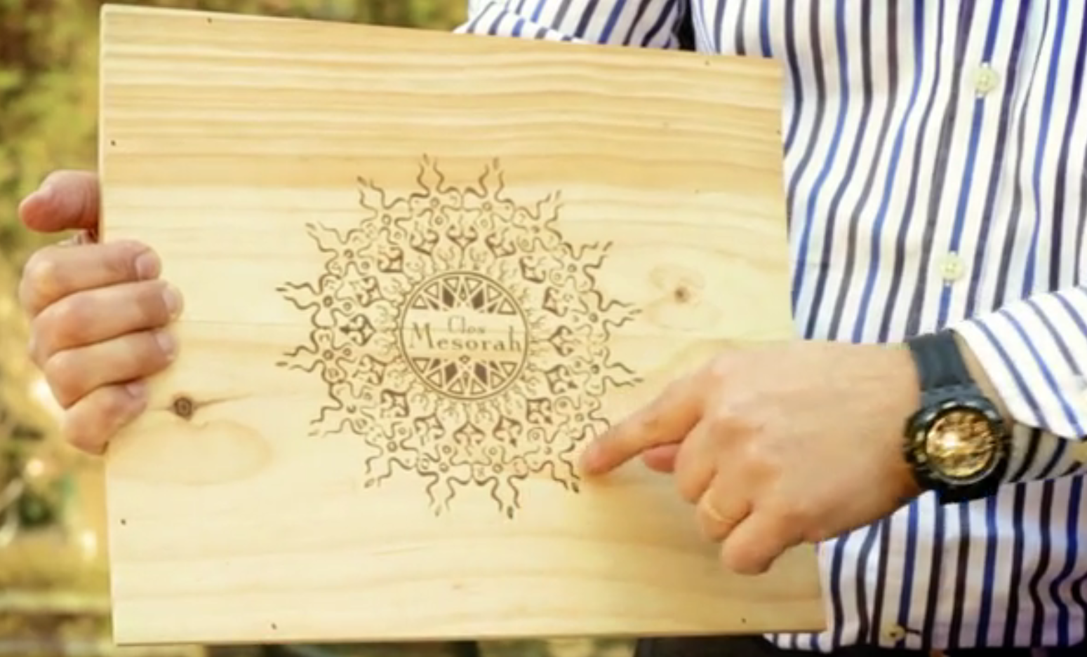 As you see and hear about in the video, Clos Mesorah is the new flagship wine from Moises’s family vineyard. It is of course organically maintained and estate bottled. The wine is the clear winner of the line, edging out the previous flagship wine; El26, also from the D.O. Montsant region, though not from his family’s vineyard. The label on the Clos Mesorah is breathtaking! The artwork was done by Joan Josep Bertran, a highly accomplished and particularly spectacular artist in his own right, as you can see from his work. If you look closely the words that are faintly visible on the label are: