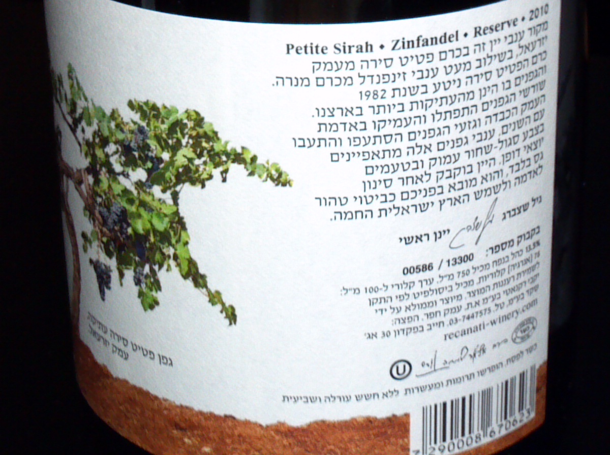 2010 Recanati Petite Sirah & Zinfandel, Reserve – close up back label