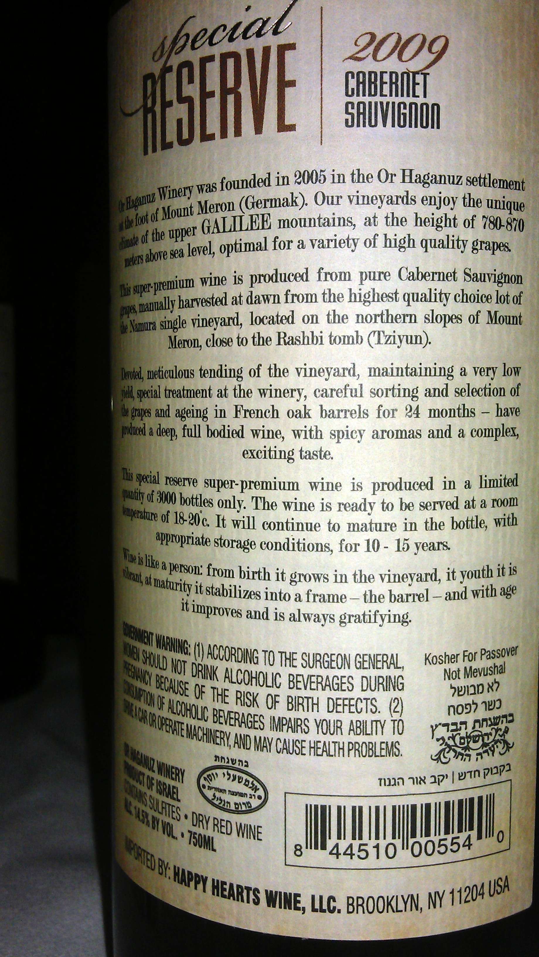 2009 Or haganuz Cabernet Sauvignon, Special Reserve – back label