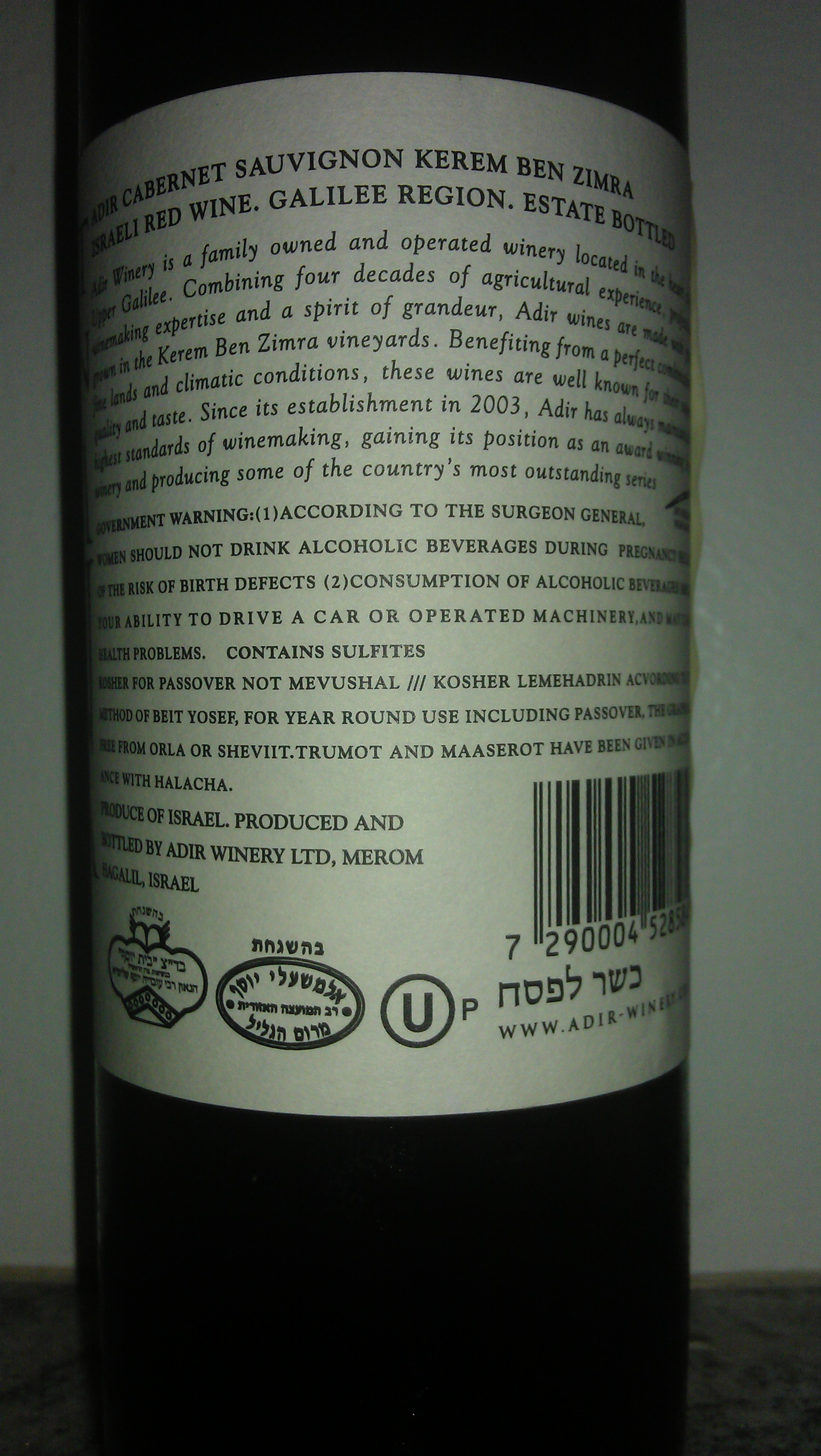 2009 Adir Cabernet Sauvignon – Ben Zimra – back label