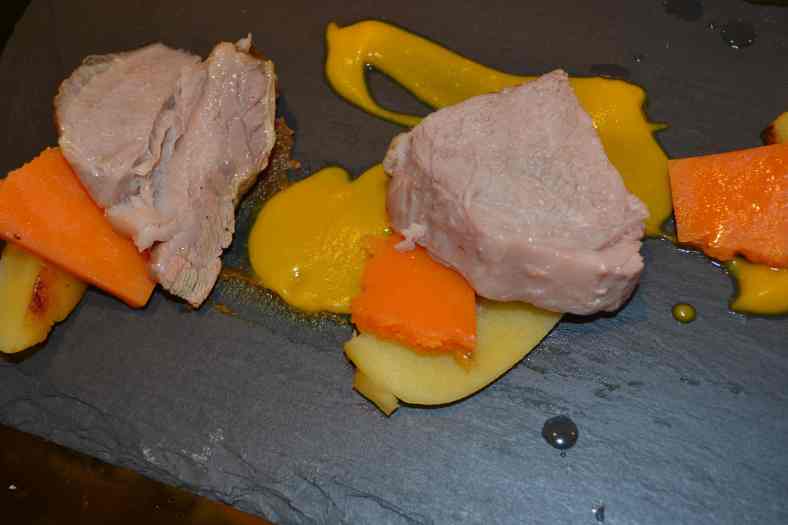 Cider brined Veal Loin and eye, apples, butternut puree, miso butterscotch puree, butterscotch chunks