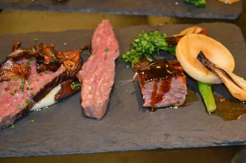 Short rib, turnip, charred broccolini, spring onion, and soy glaze. Crescent butchers cut. Wagyu ribeye, goose fat potato puree, and chanterelle mushrooms