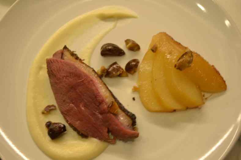 Slow cooked goose breast, maple poached pear, celery root puree, pears, and Chestnuts