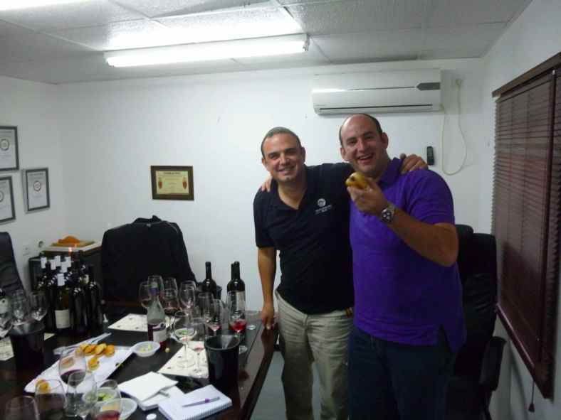 Olivier Fratty and Gabriel Geller enjoying Fricassee after tasting 17 bottles of wine at Teperberg Winery-small