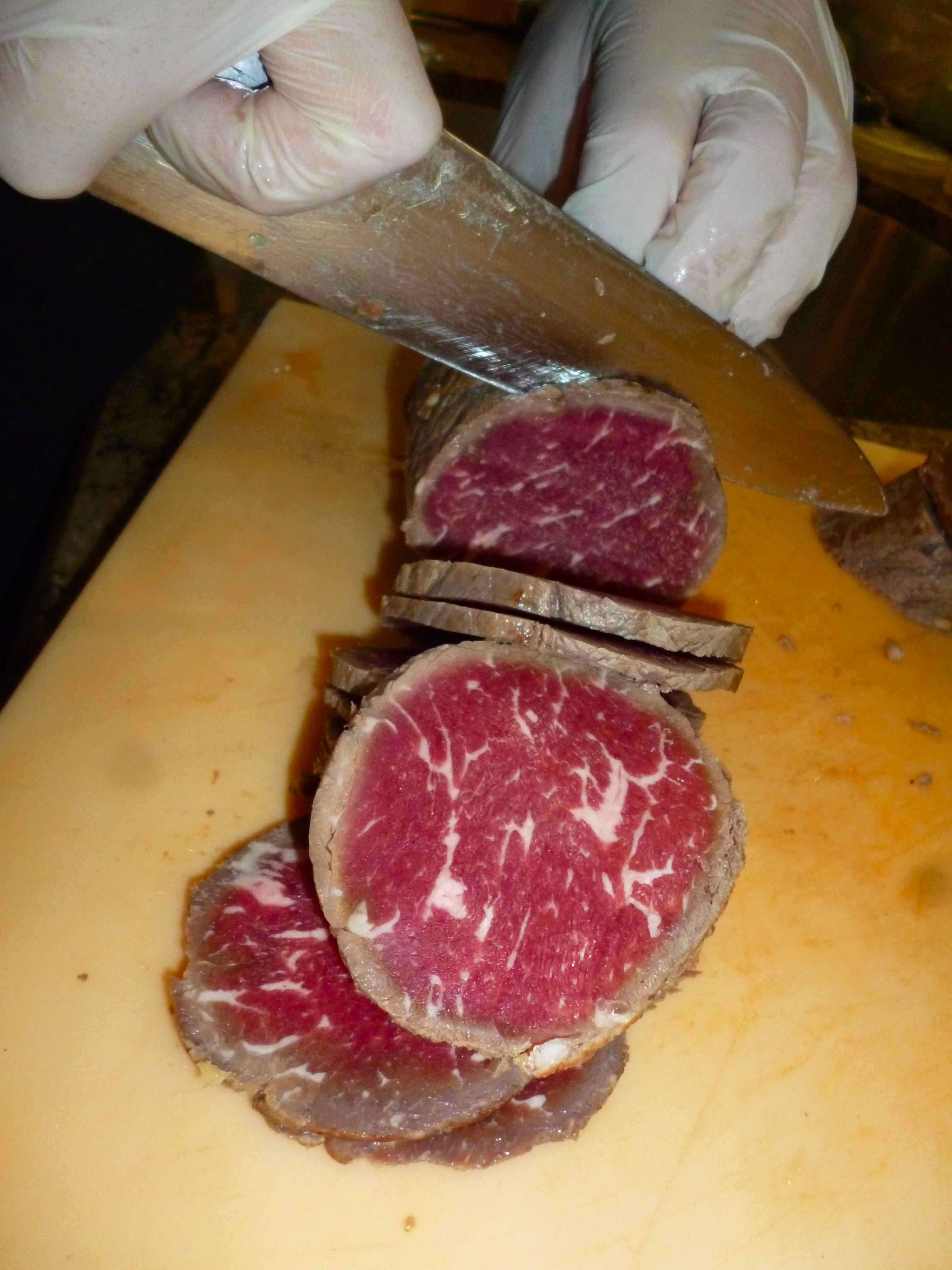 The eleventh course was Beef Rib Eye Carpaccio, Bone Marrow Torchon on shmaltz Brioche, and Cherry Mustard Tapenade that went insanely well, maybe the best pairing of the night, with a bottle of 2009 Clos Mesorah, a plush, rich, and concentrated blended wine from Moises Cohen’s own vineyard, near his home. This course was three parts painstakingly put together. There was the lovely Beef Carpaccio – rich, mouth coating, melting and luscious. Then there was the goose fat brioche that was baked and then cut into small round pieces, and then pan fried to add crunch and complexity. Finally, there is the bone marrow that was made into a Torchon – sliced, and then blow torched until it was perfect! The Torchon was decadent, while the brioche added body and crunch the party. The Beef Rib Eye Carpaccio was more decadence – and may well have been my favorite dish overall, though it is hard to beat the Short Rib Pastrami (course 14)!