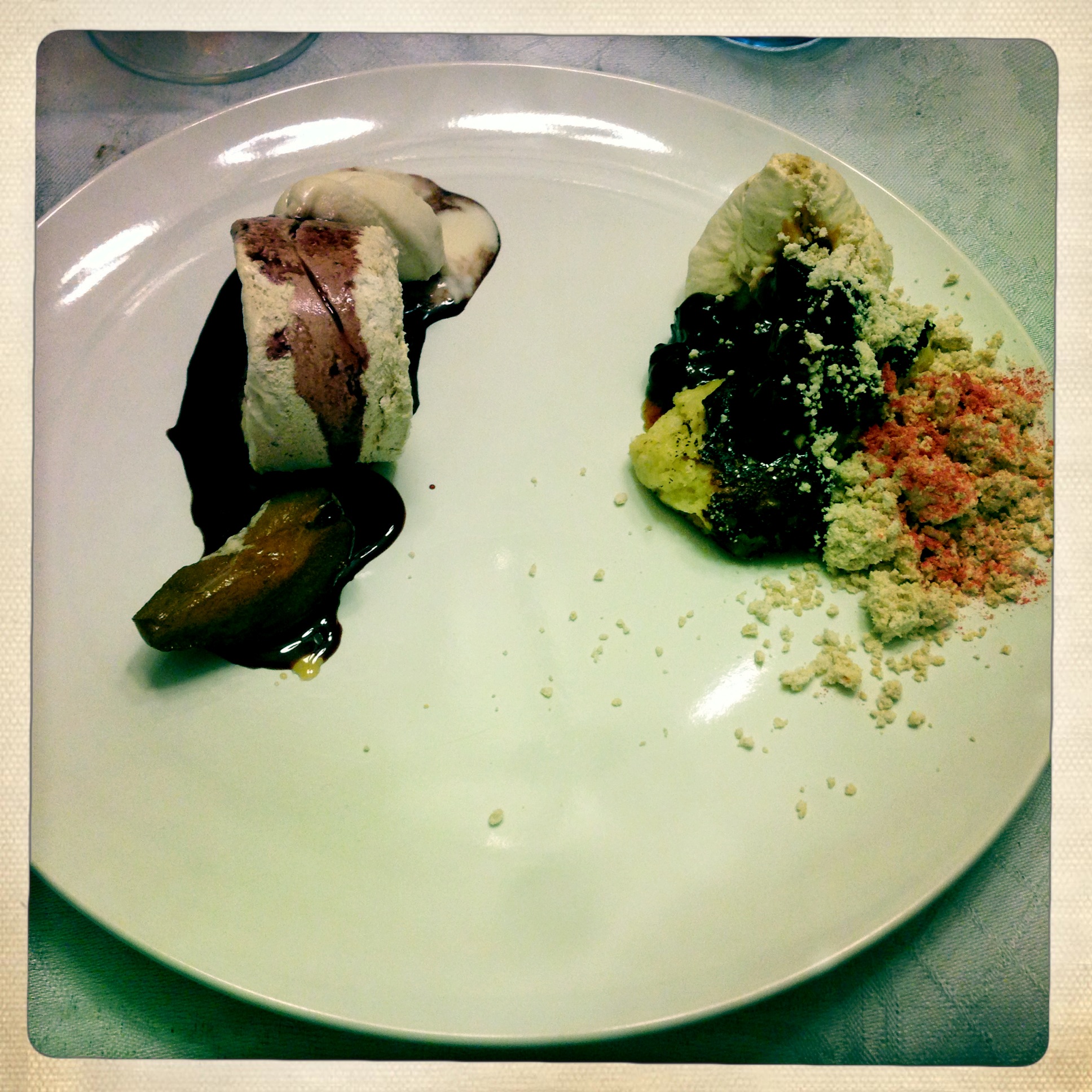 Peanut Butter Mousse, Caramelized Bananas, Bacon Jam, French Toast and Smoked Cinnamon Parfait, Vanilla Ice Cream, Red Wine Caramel