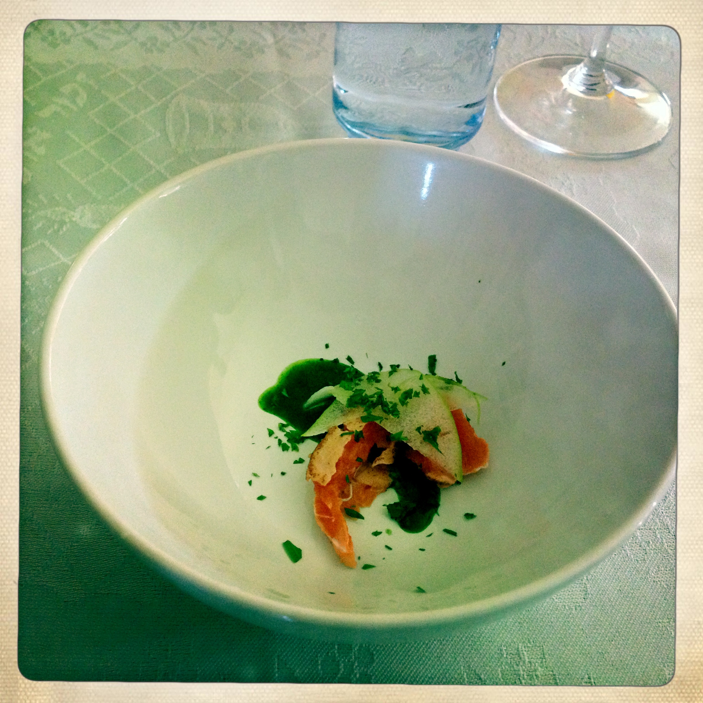 Seared Salmon Belly, Watercress Puree, Pickled Apple, Young Ginger, Lemongrass