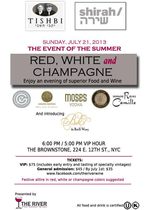The River Wine, a kosher wine distributor of Israeli, French, and California wines is holding a lovely event on July 21st for all of you wine lovers in the New York area. The event is a two-part affair – the VIP tasting is at 5 PM and the main event is at 6 PM. The wines being poured at the event includes wines from their entire portfolio, including new ones from the Rose Camille Family, Shirah Wines, and Beit El Winery! Of course there will be fine food as well, and attire in red, white or Champagne colors are suggested (Short, t-shirt, and red flip-flops will probably not fly).