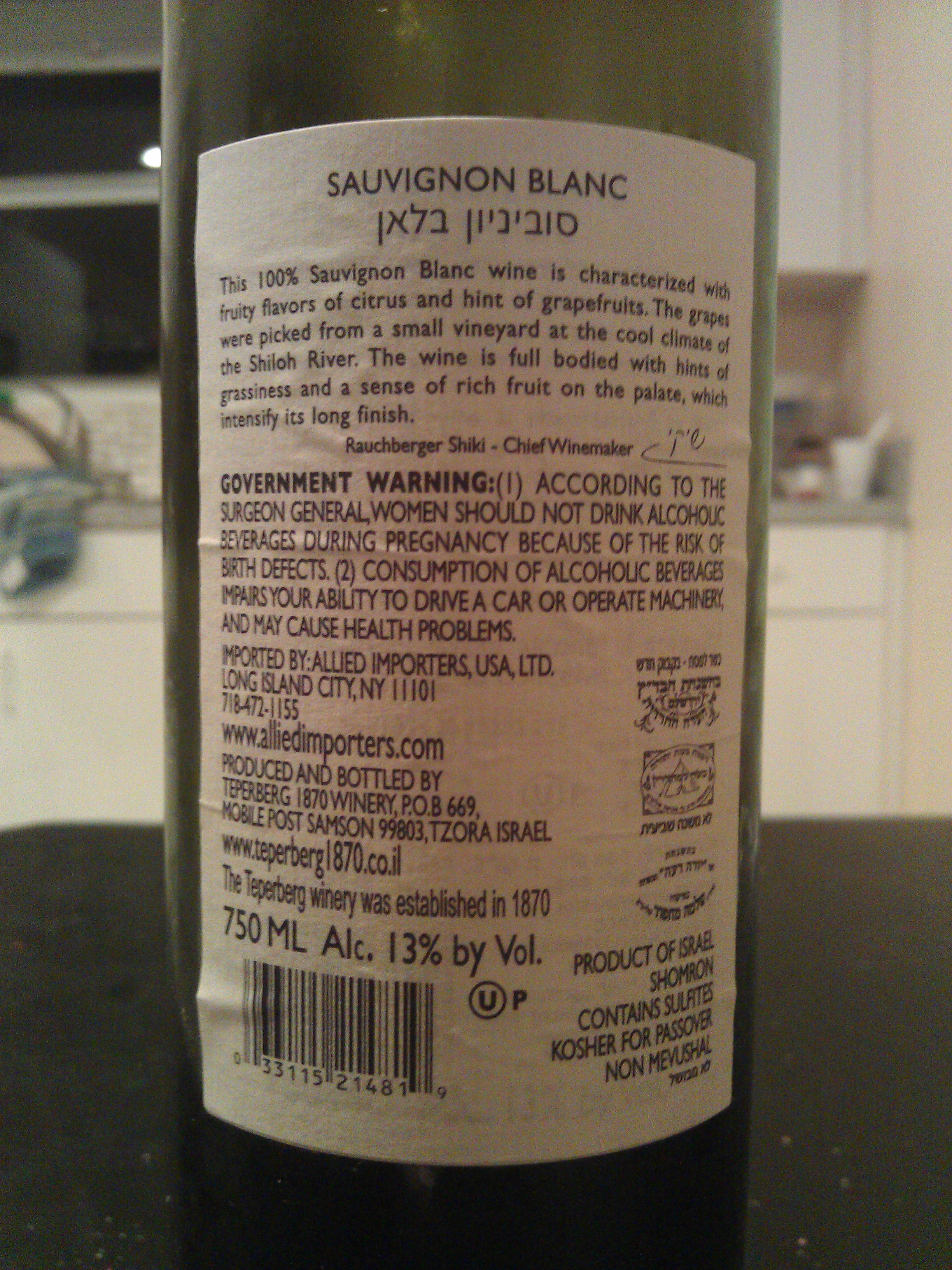 2012 Teperberg Sauvignon Blanc, Terra – back label