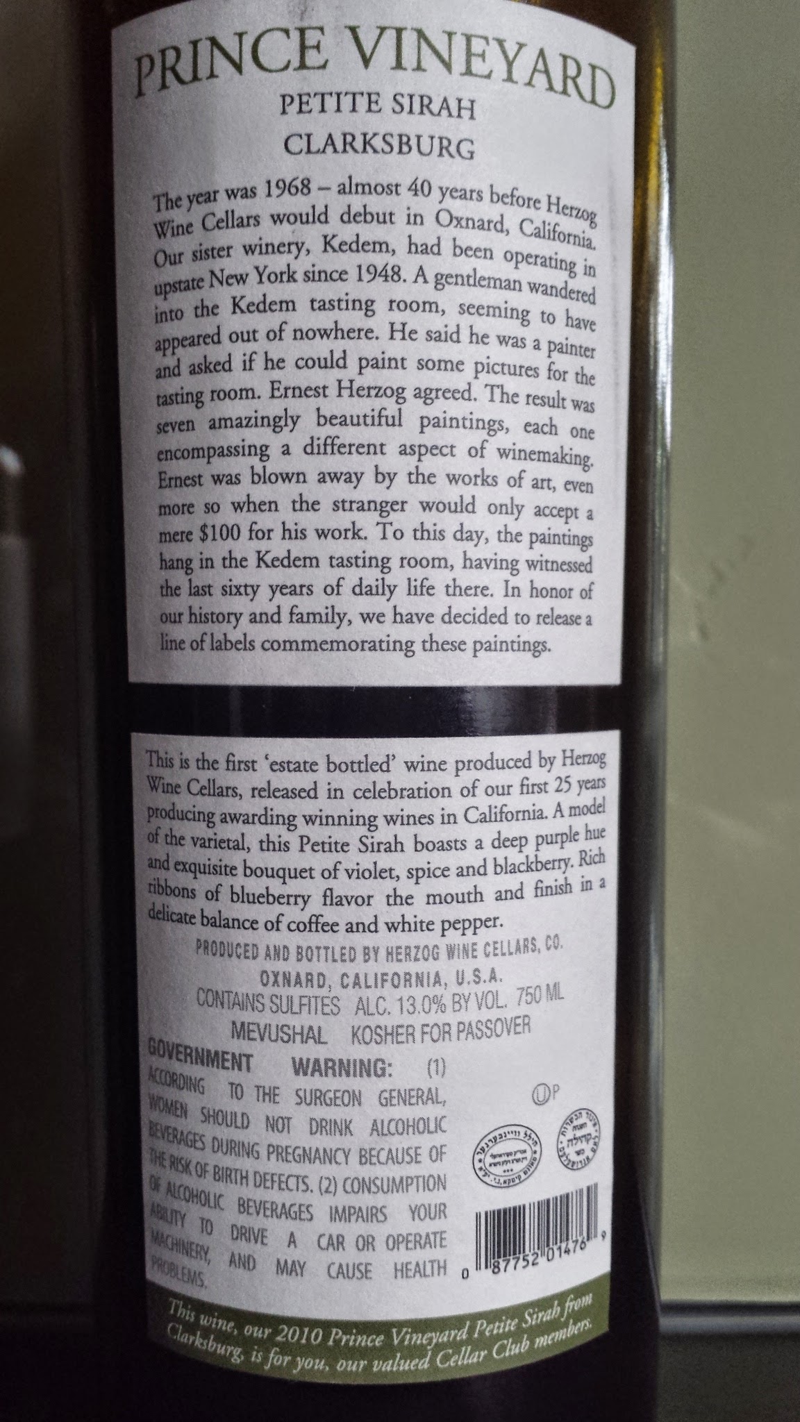 2010 Herzog Petite Sirah, Prince Vineyard – back label
