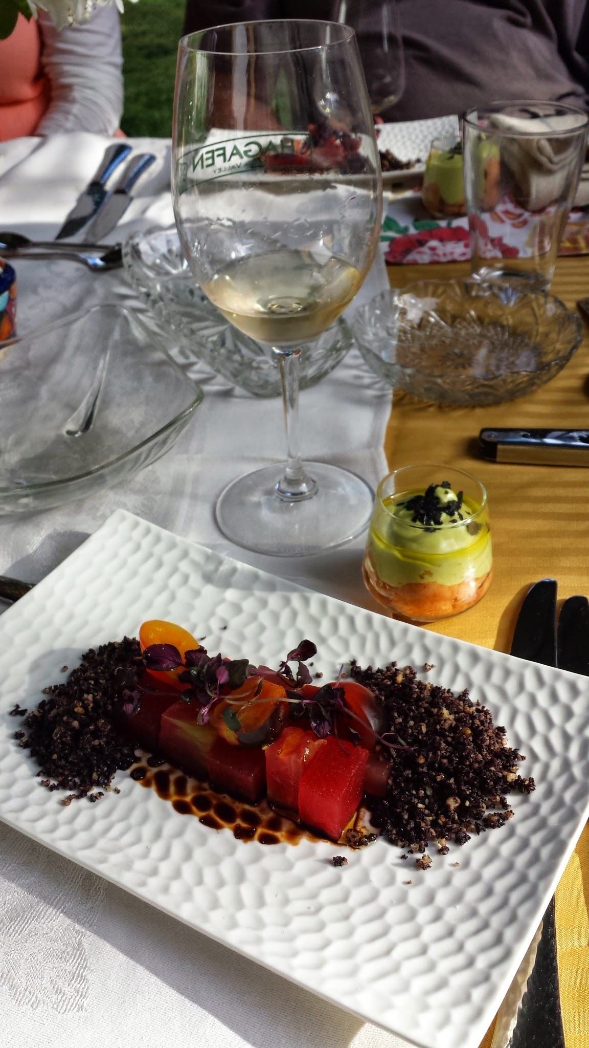 Course #1 Big Eye Tuna, with Heirloom Tomatoes, compacted watermelon, balsamic reduction, shiso dehydrated pine nut – black olive and onion dust, EVO and Yarden SB