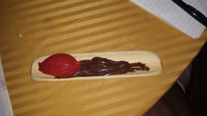 Course #12 Brownie puree, Strawberry sorbet, brownie crumbs 2
