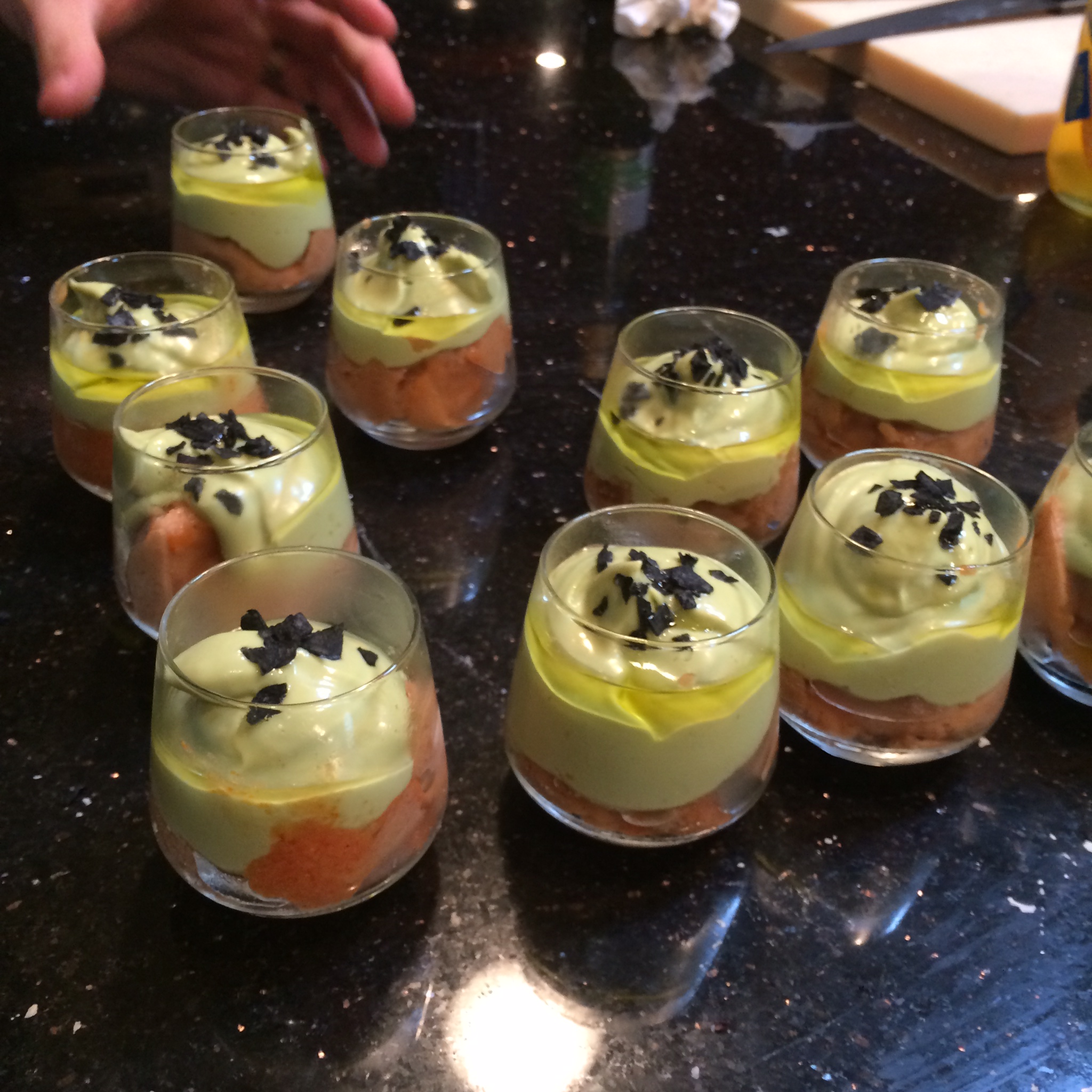 Course #2 Tomato Sorbet, Avacado Mousse, Black Salt, Pistachio oil – on table