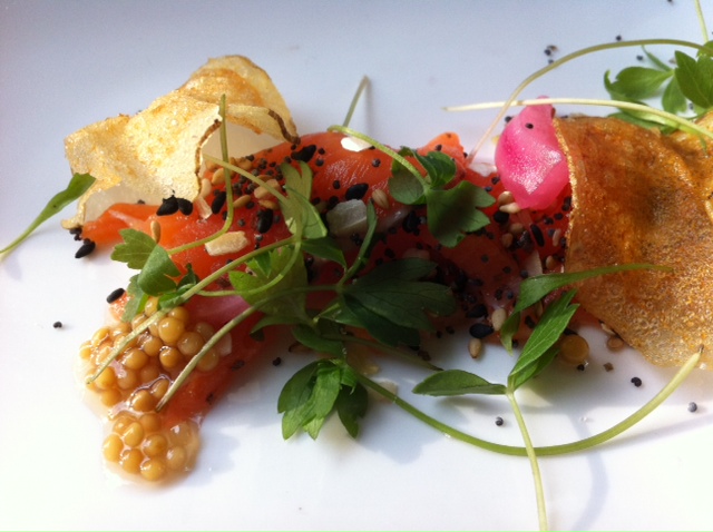 Course #3 Sockeye Salmon Crudo with bagel everything spice, pickled red onion, Mustard seed relish, smoked potato chips, lovage – close up