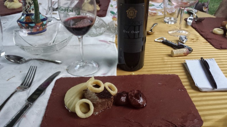Course #9 Coffee rubbed pastured boneless Beef short rib with potato puree, funyuns, and braised red wine cippolini onions and 2007 Herzog Cabernet Sauvignon, One Over VII, Napa Valley