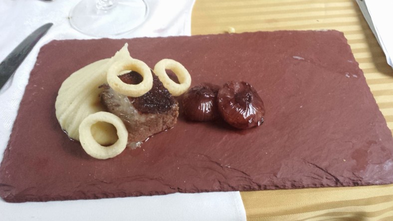 Course #9 Coffee rubbed pastured boneless Beef short rib with potato puree, funyuns, and braised red wine cippolini onions