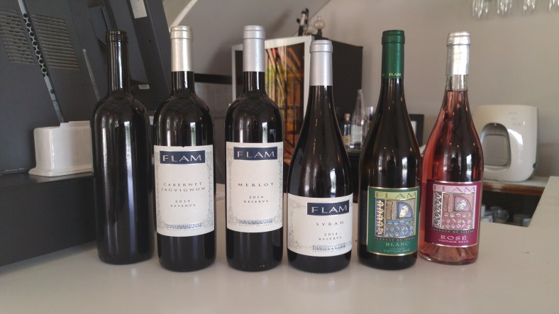 2015 Flam Rose and Flam Blanc, 2014 Flam Syrah, 2014 Flam Merlot, 2013 Flam Cabernet Sauvignon, and 2012 Flam Noble