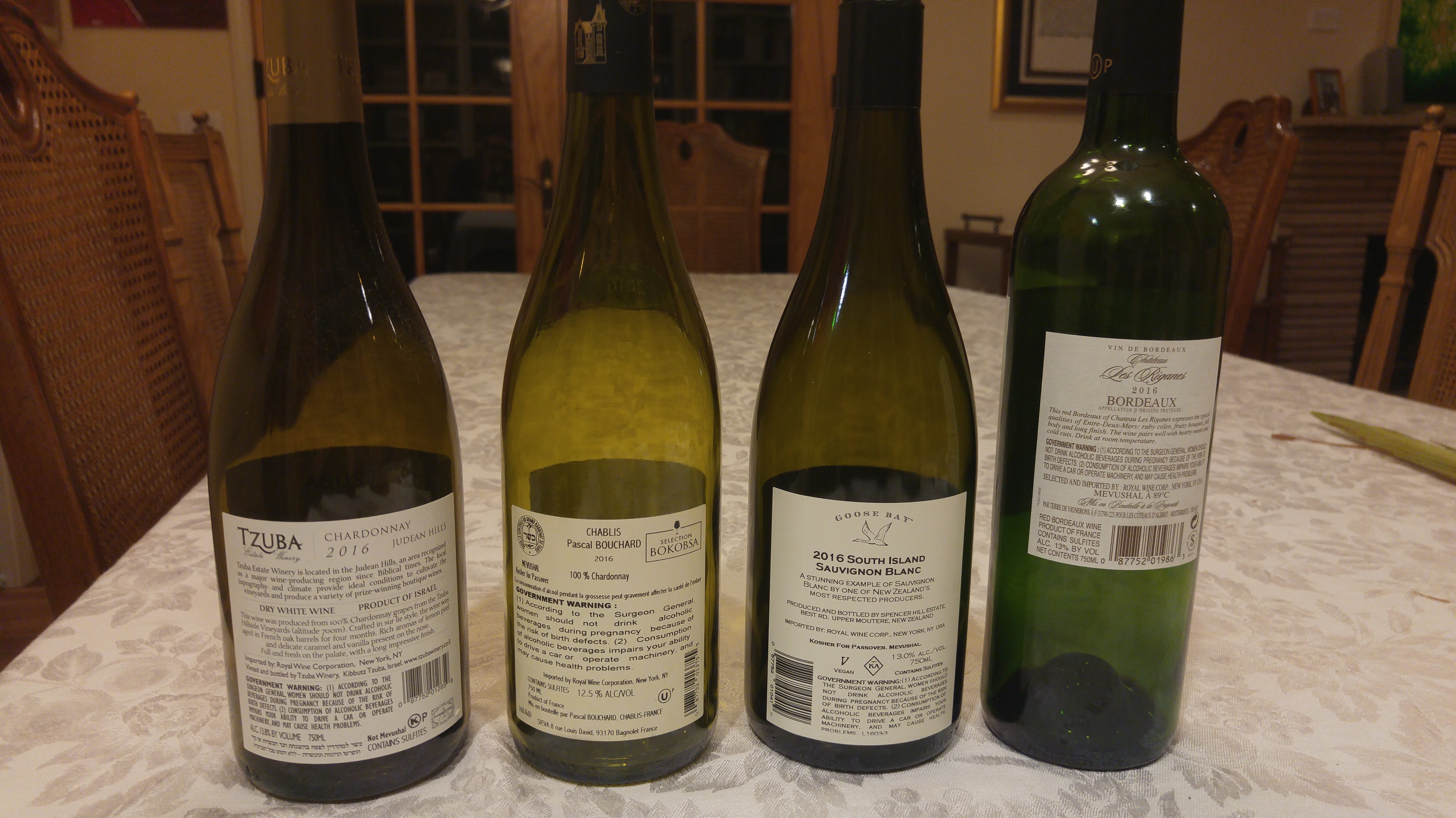 2016 Tzuba Chardonnay, Metzuda, 2016 Pascal Bouchard Chablis, 2016 Goose Bay Sauvignon Blanc, 2016 Chateau Des Riganes – bl