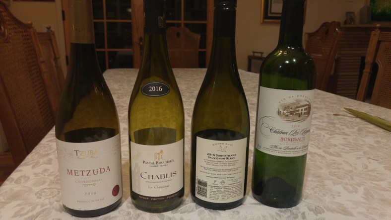 2016 Tzuba Chardonnay, Metzuda, 2016 Pascal Bouchard Chablis, 2016 Goose Bay Sauvignon Blanc, 2016 Chateau Des Riganes