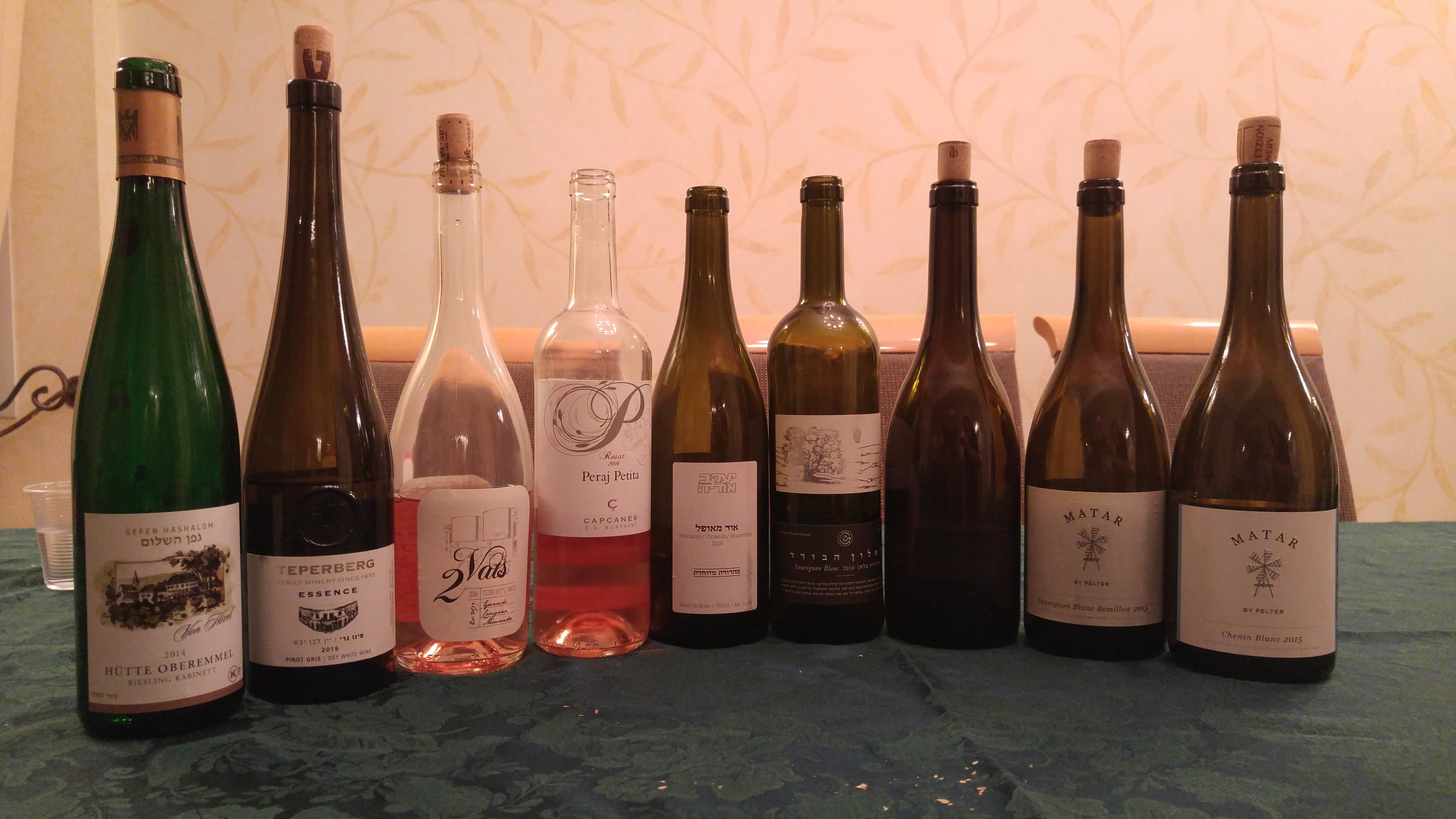 2014 Gefen Hashalom Hutte Oberemmel Riesling, 2016 Carmel Rose, 2 Vats, 2016 Yaacov Oryah blanc de noir, 2016 Gush Etzion Sauvignon Blanc, 2015 Shirah Furmint, 2015 Matar Sauvignon Blanc, 2016 Capcanes Peraj Habib Rosat