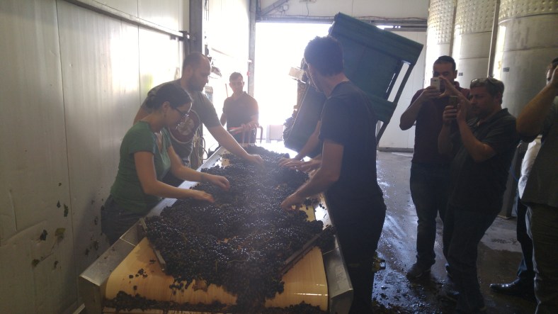 Petit Verdot clusters being sorted at Tzora Vineyards Winery