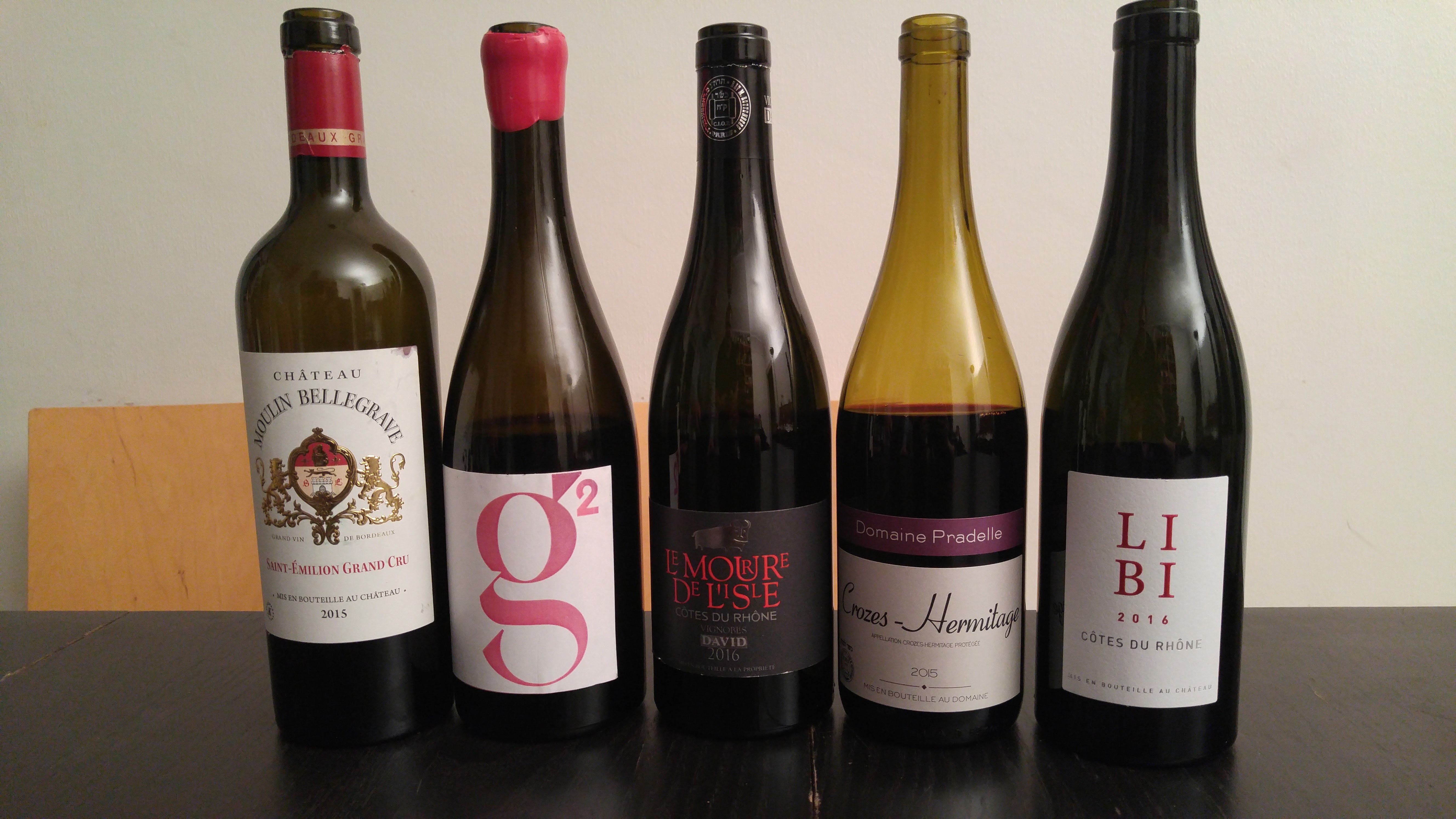 2015 Chateau Moulin Bellegrave, Saint Emillon, 2015 Gameret de Geneve, 2016 La Mourre de Lisle, Red, 2015 crozes hermitage, 2016 LI BI Cotes du Rhone, Red