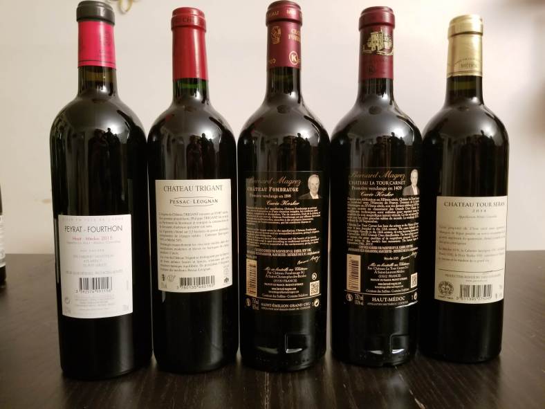 2015 Peyrat-Fourthon, Haut-Medoc, 2014 Chateau Trigant, Pessac Leognan, 2015 Chateau Fombrauge, 2015 Chateau La Tour Carnet, Haut Medoc, 2014 Chateau Tour Seran, Medoc (NOT Mevushal) – b