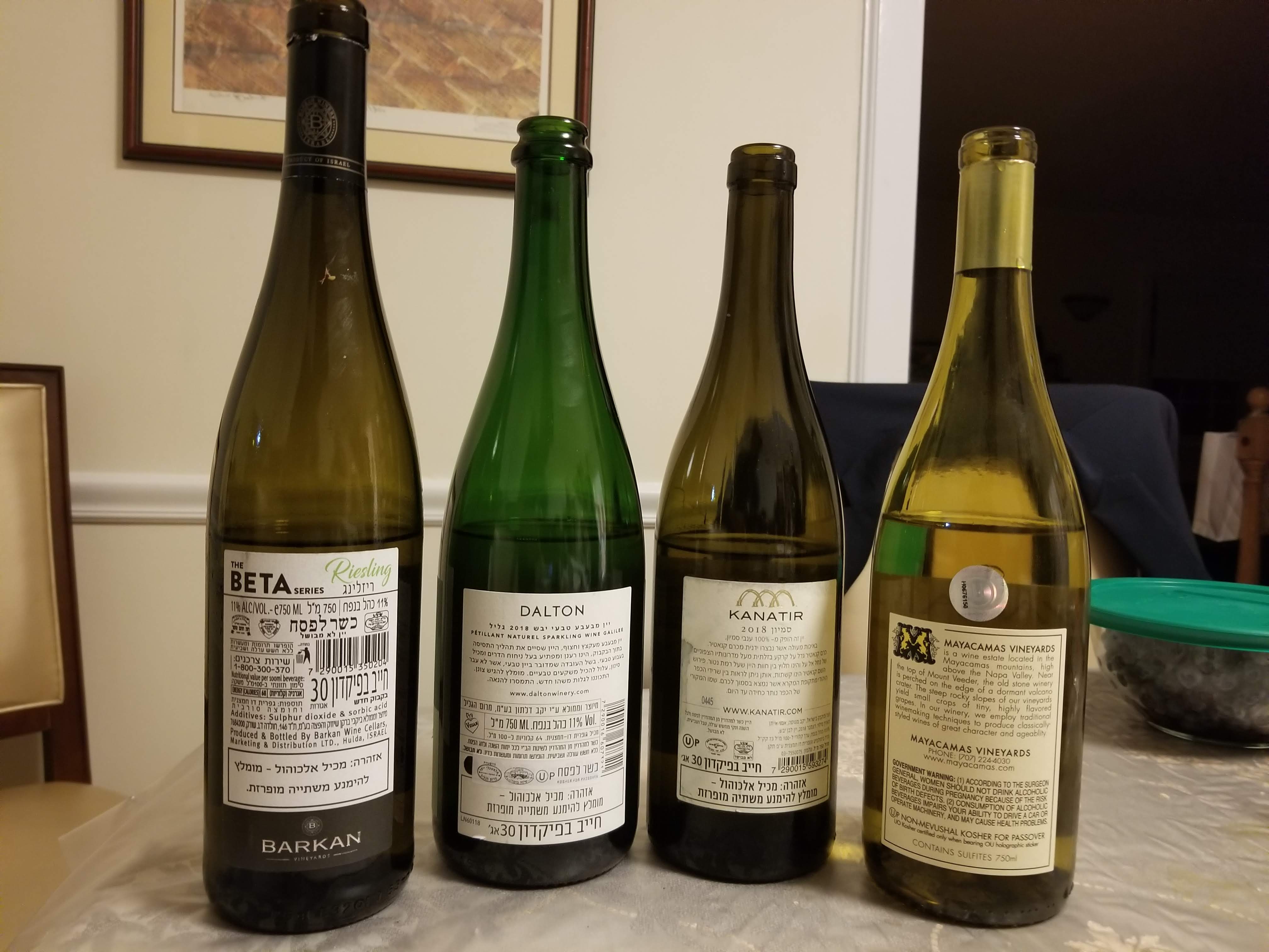2018 Barkan Riesling, Beta Series, Single Vineyard, 2018 Dalton Pet Nat, 2018 Kanatir Semillon, Light Cape, 2016 Mayacamas Chardonnay – bl