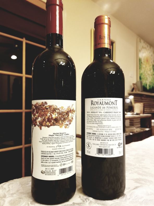 2014 Recanati Merlot, Reserve, Manara Vineyard, 2016 Chateau Royaumont – bl