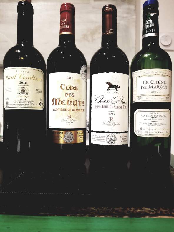 2015 Chateau Haut Condissas, Prestige, Medoc, 2015 Clos des Menuts, Saint-Emilion, Grand Cru, 2015 Chateau Cheval Brun, Saint-Emilion, Grand Cru, 2014 La Chene de Margot (AKA Chateau Bellerive Dubois), Blanc, Blaye