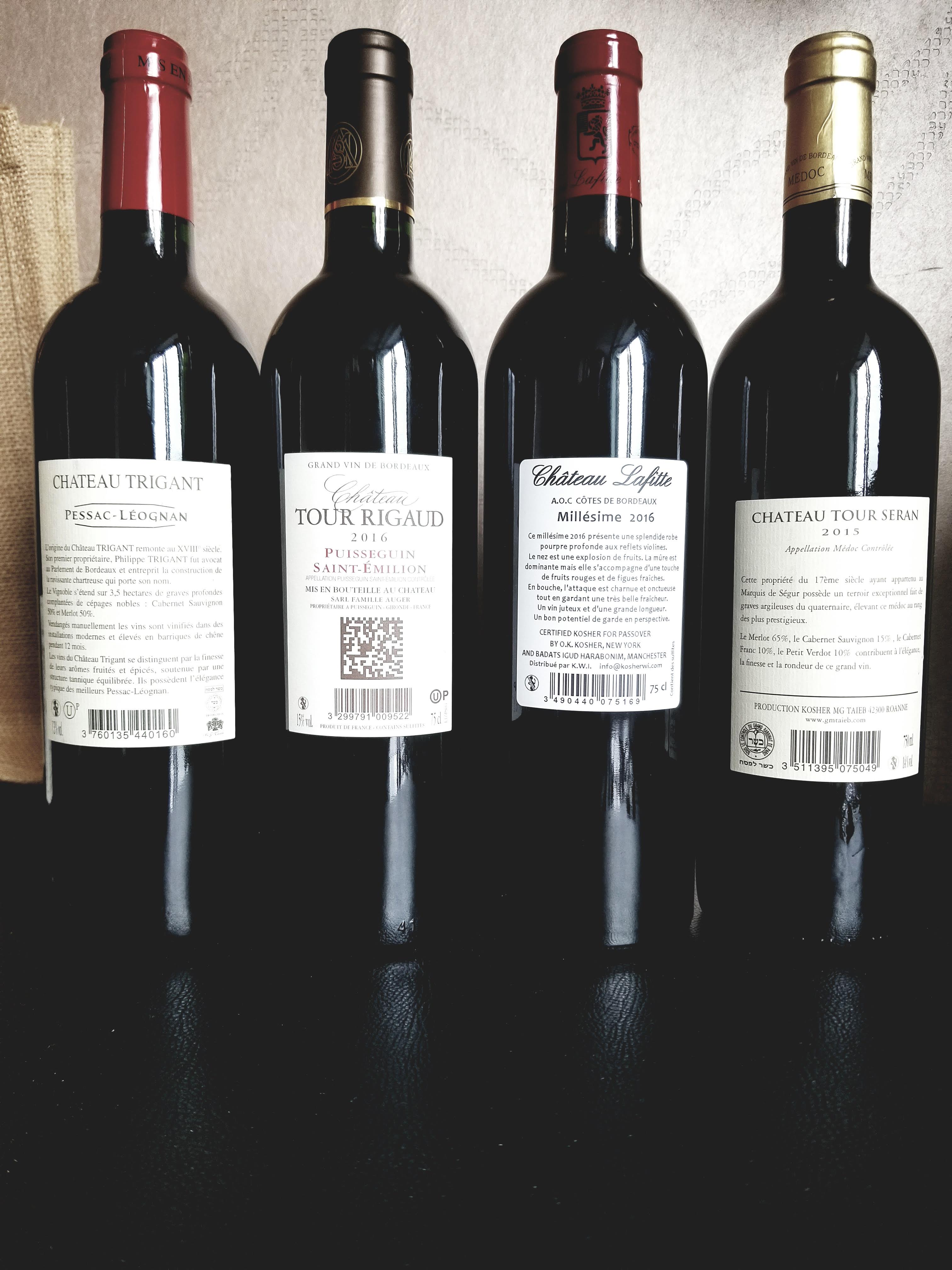 2014 Chateau Trigant, Pessac-Leognan, 2016 Chateau Rigaud, Puisseguin Saint-Emilion, 2016 Chateau Lafitte, Cotes de Bordeaux, 2015 Chateau Tour Seran, Medoc – bl