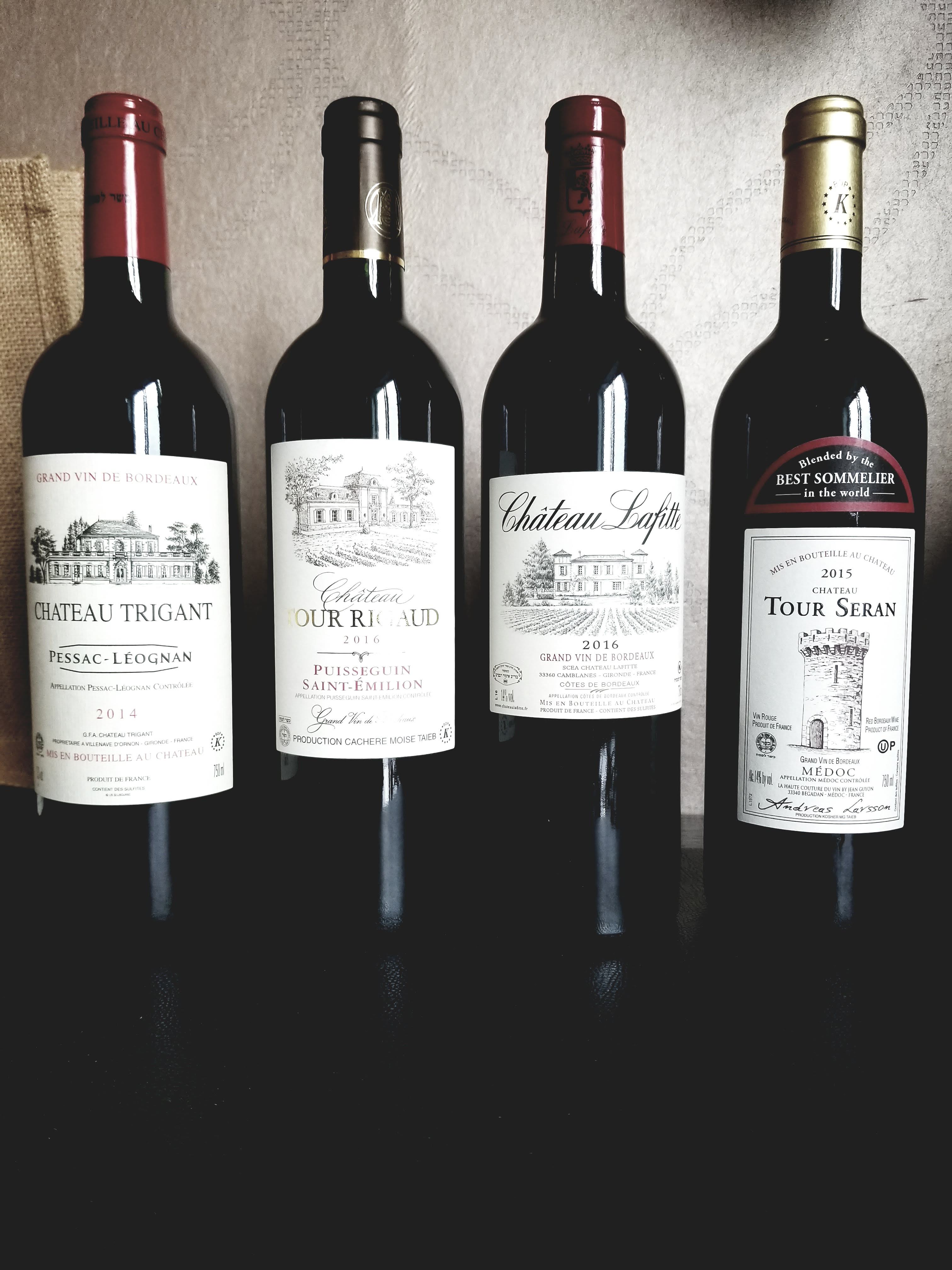 2014 Chateau Trigant, Pessac-Leognan, 2016 Chateau Rigaud, Puisseguin Saint-Emilion, 2016 Chateau Lafitte, Cotes de Bordeaux, 2015 Chateau Tour Seran, Medoc