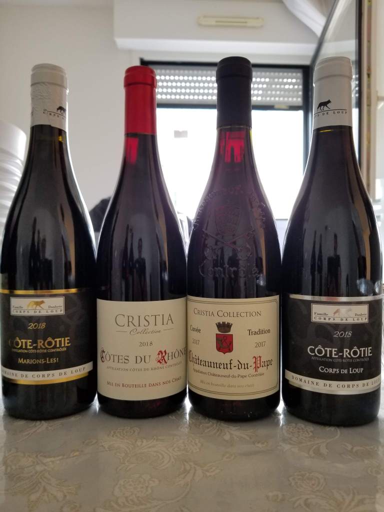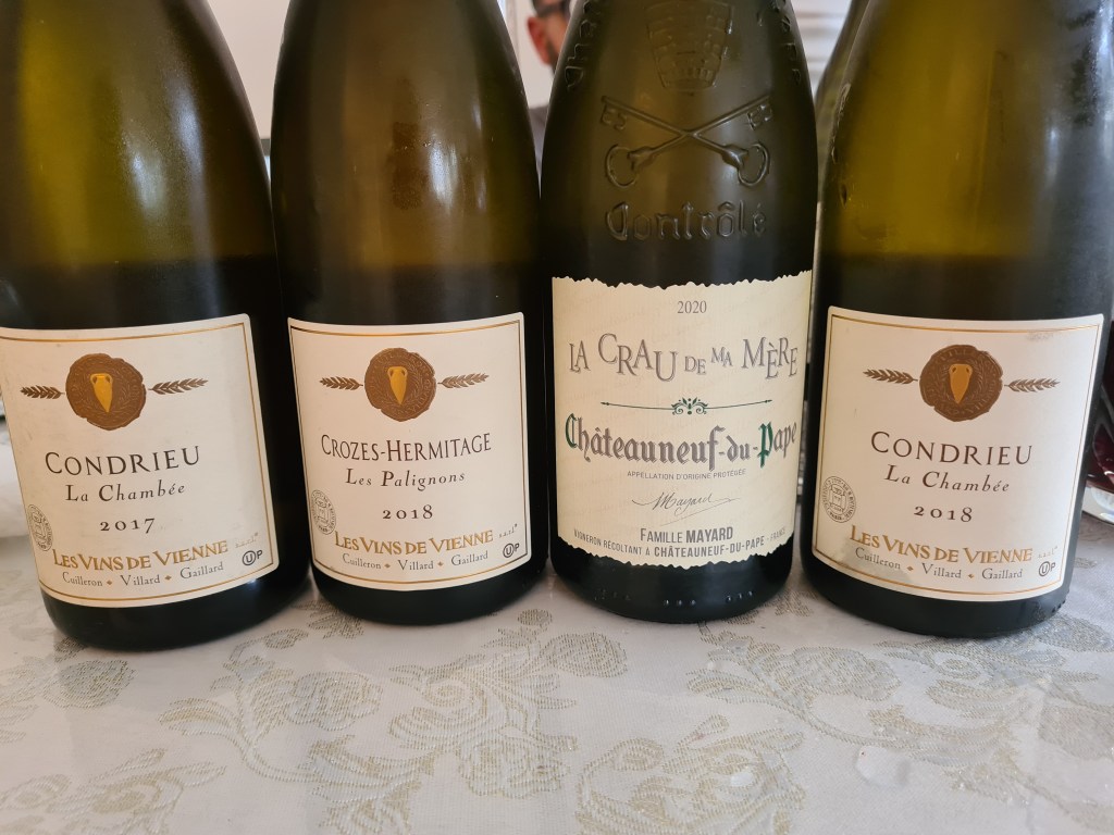 Next, we had four Rhone white wines, all were again made by Les Vin de Vienne and Famille Mayard for Nathan Grandjean. Two Condrieu, one Crozes-Hermitage, and one Chateauneuf-du-Pape. Very nice. Two more WINNERS here!