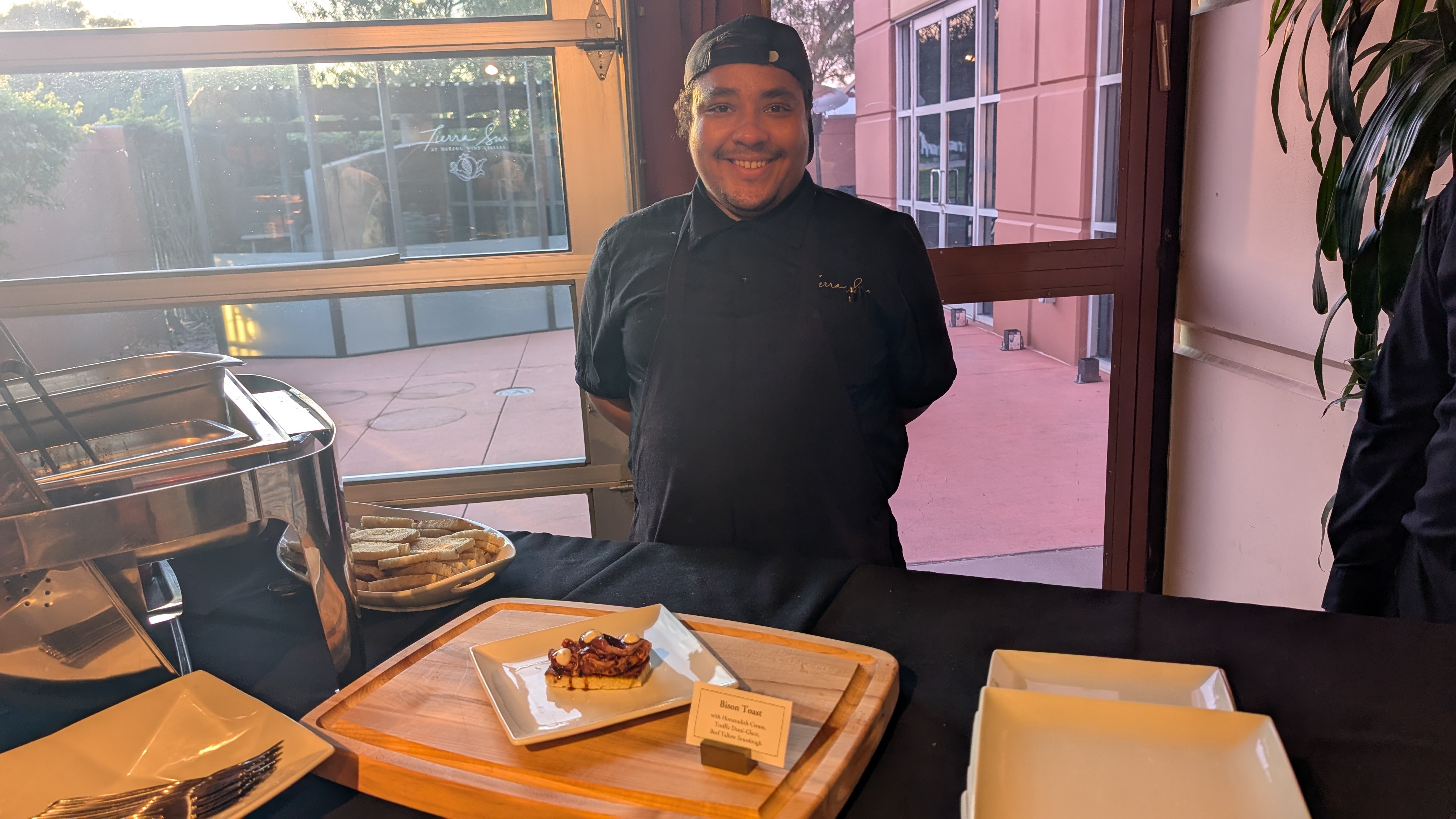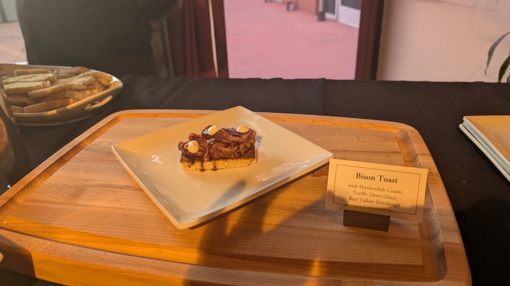 The following table included the 2023 Herzog Cabernet Sauvignon, Eminence, Special Edition; the 2023 Herzog Cabernet Sauvignon, Special Edition CH (Chalk Hill); and the 2023 Herzog Cabernet Sauvignon, Rutherford. The Eminence is a new Special Edition wine, a blend of grapes sourced from Sonoma County. On the table was the best dish of the night by far, the Bison Toast with horseradish, truffle demi-glace, on Beef Tallow Sourdough. I enjoyed a bunch of the Bison without the bread, along with the lovely salad from the other room, for my dinner before my ride home! Bravo! The horseradish cream was to die for and paired perfectly with the Bison!