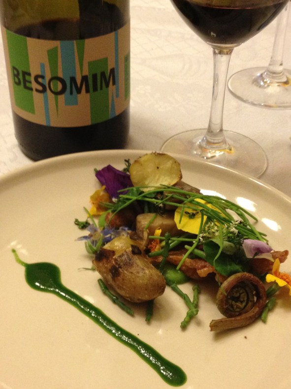 Surf and Turf Salad- Fried Chicken Skins, Sea Beans, Nasturtium, Pansies, petit onions, root greens, Romaine Puree, Spring Green Pea Gazpacho, Morels, Fiddlehead Ferns, Poached Baby Potatoes, Shaved Chorizo and NV Besomim (Zin:PS) 2