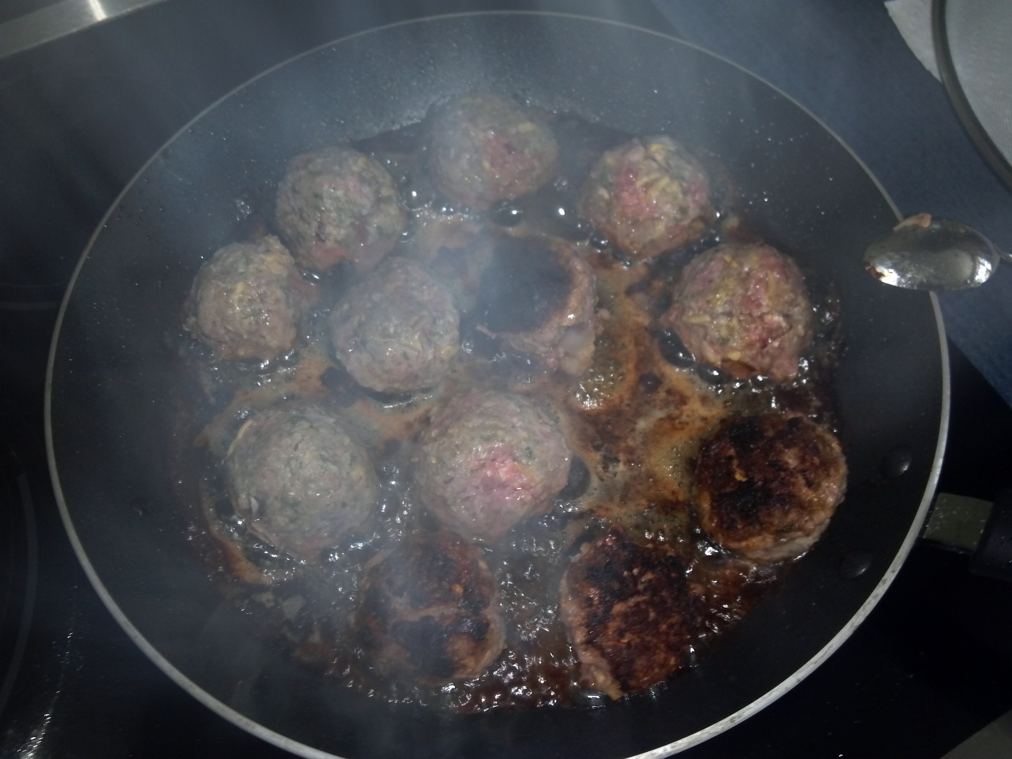 This past weekend, I was on a mission from God (in my mind anyway) to make the best possible meatball possible. My wife thinks I have gone crazy, because to her the meatballs we have made in the past were fine to her, and they are. Still, my quest to make the perfect meatball cannot be quenched, though this past iteration was quite possibly my best. There are some more tweaks we will need to do, but more on that soon. Now I wanted to make a single meatball recipe, but two different sauces. Why? Simple, my wife was not interested in a meat based sauce, and I did. Now the only con to frying meatballs is that the sauce you make has no meat flavor in it. Yes, the onions and base can start from the fat that is rendered from the fried meatballs, but that still does not cut it. A true meat sauce requires meat flavors to be fully integrated in the sauce, via cooking and reducing with the meat, thereby concentrating the meat and tomato flavors, in combination. Further, I was NOT going to braise the meatballs after I went to the trouble of frying them and getting them nice and crunchy to only lose that in a pot of sauce!